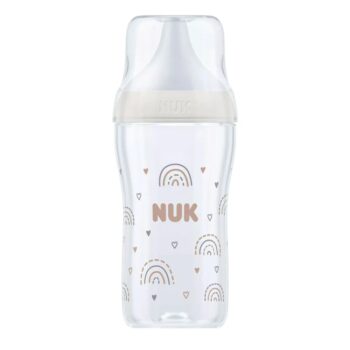 Caracteristici Biberon polipropilena cu tetina silicon si control de temperatura Nuk PM 260 ml 3 luni + M Rainbow: Scala integrata arata temperatura alimentelor: indicatorul pentru T normala a lichidului este colorat in albastru, daca devine alb, inseamna ca mancarea este fierbinte Tetina marimea M, moale si elastica pentru o hranire cat mai confortabila Forma tetinei se ingusteaza usor, asigurand un flux de hranire cat mai confortabil Sterilizati inainte de prima utilizare si dupa fiecare utilizare ulterioara Capacitate: 260 ml