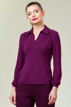 Bluza Charlotte din jersey cu guler si decolteu anchior, croiala cu incretire pe umeri pentru un plus de comfort. Modelul din imagine poarta marimea 36 si are 177 cm.