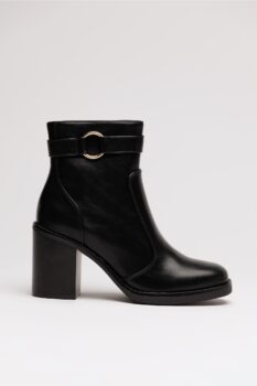 Botine elegante negre din piele ecologica. Au varf rotund, toc patrat, catarama aurie si se inchid cu fermoar. Botine elegante Varf rotund Toc patrat Se inchide cu fermoar lateral Material: Piele ecologica Inaltime toc: 8 cm *Va rugam verificati eticheta produsului inainte de curatare! *Va rugam sa retineti ca o usoara discrepanta de culoare ar trebui sa fie acceptabila datorita luminii si luminozitatii ecranului. *Va rugam verificati ghidul de marimi, in cm, pentru a alege corect marimea.