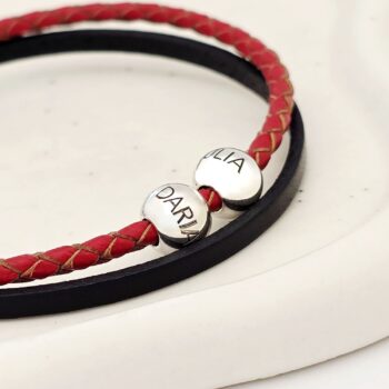 Bratara duo cu 2 straturi piele impletita rosie si neagra & 2 bilute  din Argint 925 – Inchizatoare inox Această brățară duo este realizată din piele naturală împletită în două straturi, roșu vibrant și negru intens. Este decorată cu două biluțe din Argint 925,  pentru un plus de rafinament. Închiderea din inox asigură durabilitate și un look masculin, modern. Adaugă un strop de stil personal ținutei tale – comandă acum brățara care îmbină eleganța cu atitudinea! Caracteristici produs: Material: Argint 925 Dimensiune : 8 mm Decorare: Decorat cu text personalizat. Greutate: Aproximativ 1.64 grame Procesul de productie Chic Bijoux: Aceasta bijuterie personalizata este realizata de la zero pentru fiecare comanda in parte. Dupa plasarea si confirmarea comenzii, incepe procesul ei de creatie: Realizare Design -> Taiere/Personalizare -> Finisare manuala -> Polish Final -> Ambalare -> Livrare! Datorita procesului de productie si a personalizarii bijuteriei dupa propria dorinta,  gramajul final al produsului poate varia . Pe site este afisat gramajul obtinut prin cantarirea produsului din pozele de prezentare. Pretul include, pe langa costul gramului de  Argint 925 , intregul proces de productie si personalizare, garantand un produs unic si special, creat doar pentru tine. De ce sa alegi Chic Bijoux? Fiecare bijuterie Chic Bijoux este realizata cu pasiune, respectand cele mai inalte standarde de calitate: Bijuterii unice realizate manual, personalizate pentru fiecare client. Ambalaj premium, perfect pentru a fi oferit cadou. Garantia calitatii:  din 2010 producem bijuterii din metale pretioase de cea mai bună calitate folosind tehnologie de ultimă generație și finisare manuală. Dupa plasarea comenzii, vei fi contactat de un reprezentant al echipei Chic Bijoux pentru toate detaliile necesare personalizarii produsului si a ne asigura ca produsul final corespunde asteptarilor tale. Toate produsele din Argint 925 comercializate de Chic Bijoux sunt marcate cu titlul Argintului · 925.
