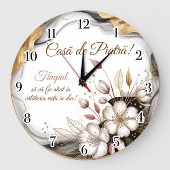 Ceas Casa de piatra flowers and marble Oferă un cadou elegant și plin de simboluri pentru un cuplu proaspăt căsătorit cu ceasul de perete Casa de Piatră – Flowers & Marble. Realizat prin imprimare UV de înaltă calitate, acesta combină frumusețea florilor cu rafinamentul texturii de marmură, pentru un decor sofisticat. ✅ Design floral rafinat, în nuanțe albe și detalii aurii, perfect pentru o aniversare de căsătorie sau un gest special.✅ Personalizare inclusă: nume, data căsătoriei, mesaj special✅ Print UV durabil ✅ Mecanism silențios – fără ticăit✅ Dimensiuni: 30 cm✅ Produs cu drag în România Ideal pentru părinți, bunici sau orice cuplu care merită sărbătorit cu stil!