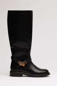 Cizmele au un design modern , cu un aspect masiv, potrivit pentru sezonul rece. Au talpa groasa, catarama metalica aurie si se inchid cu fermoar lateral . Cizme lungi casual Talpa joasa groasa Varf rotund Catarama aurie Inchidere cu fermoar in lateral Inaltime cizme: 43 cm Material: piele ecologica