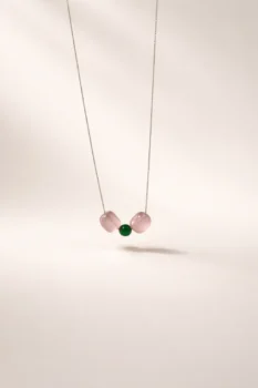 Colierul Harmonia surprinde echilibrul perfect dintre culoare, formă și lumină. Două elemente din jad roz pal, cu transparențe catifelate, încadrează o bilă centrală din jad verde intens – un punct de calm și vitalitate. Montate pe un lanț fin din argint, pietrele par să plutească delicat pe piele, într-o compoziție simplă, dar profund expresivă. Parte din colecția Santorini, Harmonia evocă contrastul subtil dintre piatra caldă a insulei și verdele viu al grădinilor ascunse, dintre liniștea mării și energia pământului. Un colier rafinat, ușor de purtat zi de zi, creat pentru a aduce o stare de echilibru, feminitate și eleganță naturală.Compoziție: argint, jad