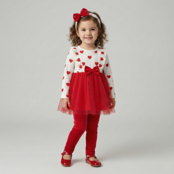 Adaugă un strop de magie în garderoba micuței tale cu noul Compleu Roșu Fetițe cu Inimioare Monica. Gândit special pentru a îmbina confortul cu un design festiv, acest set este alegerea ideală pentru ocazii speciale, ședințe foto de Crăciun sau pur și simplu pentru o zi în care vrea să se simtă ca o prințesă. De ce să alegi Compleul Monica? Design Adorabil: Partea de sus este realizată dintr-un material alb, reiat, presărat cu inimioare roșii jucăușe. Volănașele delicate de pe umeri și fundița roșie din talie adaugă un plus de rafinament. Confort Sporit: Setul include o fustiță din tulle fin roșu, suprapusă, care oferă volum fără a incomoda. Versatilitate: Poate fi purtat atât la petreceri aniversare, cât și la grădiniță sau la plimbare. Caracteristici cheie: Setul conține: Tunică cu mânecă lungă și pantaloni lungi și banderolă. Culoare: Alb și Roșu intens. Imprimeu: Inimioare. Stil: Casual-Elegant, Chic. Sezon: Primăvară, Toamnă, Iarnă.