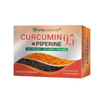 Curcumin + Piperine 95%, 30 capsule, Cosmopharm Proprietăți: Absorbție superioară, eficacitate maximă, beneficii multiple pentru organism. Formula îmbuntațită: Curcuminul C3 Extract + Piperine 95%, un duo imbatabil ce poate avea acțiune antiinflamatoare, antioxidanta. Produsul poate contribui la: – poate fi eficient în neutralizarea radicalilor liberi, ce determină procesul de îmbătrânire; – poate ajuta la reducerea inflamației din organism – Contribuie la stimularea proceselor de refacere a ţesutului conjunctiv şi a lichidului sinovial – poate avea efect antiinflamator, poate reduce durerea și discomfortul de la nivelul articulațiilor afectate – poate sprijini sistemul imunitar – poate avea efect antifungic antiviral și antibacterian – poate ajută la menținerea sănătății pielii – poate contribuie la eliminarea toxinelor – poate sprijini digestia și absorbția nutrienților – poate susține sănătatea sistemului digestiv – poate ajuta la controlul greutății corporale – poate susține funcțiile sistemului nervos – poate contribui la creșterea nivelului de serotonina și dopamina neurotransmițători responsabili pentru o stare mentală bună – poate ajuta la menținerea sănătății ficatului și împiedică acumularea grăsimilor Mod de administrare: Adulți: 1 capsula zilnic, la masă cu un pahar de apă. Ingrediente active/capsula vegetală (670mg): Curcumin C3 Complex (Curcuma longa) – extract standardizat 95% curcuminoide 400mg Piper-negru/Piper Nigrum extract standardizat 95% piperine 5mg Prezentare: 30 capsule vegetale