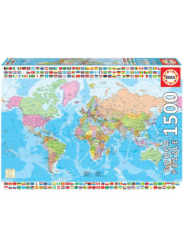 Educa The World Map este un puzzle complex, alcătuit din 1500 de piese atent realizate. Imaginea prezintă o hartă detaliată a lumii, cu ilustrații decorativ