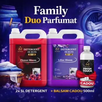 Pachet Family DUO Parfumat – Flower & Liliac EditionTransformă fiecare spălare într-o explozie florală cu pachetul Family DUO Parfumat Nuvien, ce combină două arome elegante și feminine: Flower Bloom și Liliac Bloom. În plus, primești CADOU un balsam de rufe Fresh Touch 500ml, pentru extra finețe și parfum de durată. 1x Detergent 5L Flower Bloom – parfum floral delicat și rafinat, ce oferă hainelor o prospețime plăcută și persistentă. 1x Detergent 5L Liliac Bloom – aromă intensă de liliac, vibrantă și elegantă, pentru rufe care miros a primăvară. CADOU: Balsam de rufe Fresh Touch 500ml – conferă catifelare, reduce electrizarea și completează perfect experiența parfumată.Detergenții sunt îmbogățiți cu bicarbonat, ajutând la îndepărtarea murdăriei dificile și neutralizarea mirosurilor neplăcute, chiar și la temperaturi joase. Formula concentrată oferă eficiență ridicată, protejând în același timp fibrele și culorile țesăturilor.✔ 10L detergent (2x5L)✔ Balsam 500ml CADOU✔ Curățare profundă și eficientă✔ Parfum floral intens și persistentCu Family DUO Parfumat Nuvien – Flower Bloom & Liliac Bloom, te bucuri de curățenie impecabilă și un parfum floral care îmbracă fiecare haină în prospețime.