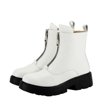 Ghete albe din piele ecologica, calitate superioara, cu talpa neagra, groasa si zimtata, in interior imblanit, sistem de inchidere cu fermoar in partea din fata, model casual;