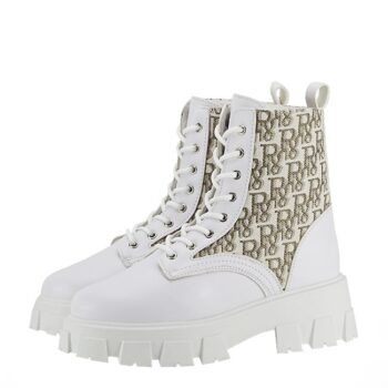 ghete albe casual din piele ecologica, partile laterale sunt din material textil bej, cu model, talpa zimtata din cauciuc flexibil, interiorul este captusit cu blanita ecologica calduroasa, talpa interioara este captusita cu blanita ecologica,…