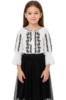 Ie traditionala fetita Claudita – ie alba din bumbac cu broderie neagra Ie traditionala Claudita pentru fetite este o piesa delicata inspirata din autenticitatea portului popular românesc. Realizata din bumbac 100% aceasta ie din bumbac ofera confort lejeritate si respirabilitate fiind ideala pentru evenimente speciale serbari sau tinute traditionale purtate cu mândrie. Broderia neagra inspirata din motivele clasice ale portului popular este dispusa armonios pe partea frontala si pe mâneci conturând un design elegant si expresiv. Contrastul dintre albul curat al materialului si broderia neagra ofera un aer rafinat pastrând în acelasi timp autenticitatea unei ii brodate traditional. Insertiile din dantela de bumbac alb adauga un plus de finete si subliniaza atentia pentru detalii. Mânecile trei sferturi sunt completate de manseta elastica si terminatie tip clopot oferind un aspect fluid si feminin. Închiderea la baza gâtului cu snur si ciucuri albi pastreaza linia traditionala specifica unei ii traditionale fiind în acelasi timp practica si confortabila. Ie traditionala alba Claudita este alegerea potrivita pentru parintii care îsi doresc o ie brodata pentru fetita cu design inspirat din port popular detalii elegante si croi lejer potrivit pentru orice moment special. Caracteristici: Ie traditionala pentru fetitaCuloare: albMaterial: 100% bumbacIe din bumbac material respirabilBroderie neagra inspirata din portul popularInsertii din dantela de bumbac albMâneci trei sferturiManseta elasticaTerminatie mâneca tip clopotÎnchidere la baza gâtului cu snur si ciucuri albiCroi lejer confortabil* Echipa noastra face toate eforturile in a prezenta cat mai bine culorile produselor prezentate pe site insa culorile pot diferi de situatia reala si pot varia în functie de setarile monitorului/dispozitivului dvs!