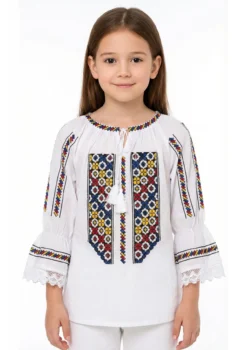 Ie traditionala fetita Ingrid – ie alba din bumbac cu broderie tricolora Ie traditionala de fetita Ingrid este o piesa delicata de port popular reinterpretat creata pentru a aduce frumusetea traditiei mai aproape de copilarie. Realizata din bumbac 100% aceasta ie din bumbac este usoara confortabila si placuta la purtare ideala pentru serbari evenimente speciale sarbatori nationale sau tinute traditionale deosebite. Broderia inspirata din motivul tricolorului ofera un plus de expresivitate si autenticitate. Modelul geometric brodat pe partea frontala si pe mâneci evidentiaza armonios nuantele de rosu galben si albastru conturate discret pentru un efect vizual echilibrat si elegant. Aceasta ie brodata pastreaza simbolistica portului popular românesc într-o varianta adaptata celor mici. Mânecile trei sferturi sunt completate de mansete elastice decorate cu volanas si banda aplicata din dantela de bumbac detalii care adauga rafinament si feminitate. Închiderea frontala cu snur alb si ciucuri subliniaza stilul traditional autentic si ofera un plus de farmec întregii tinute. Ie traditionala Ingrid este alegerea potrivita pentru parintii care îsi doresc o ie traditionala pentru fetita cu broderie atent realizata confort si un design ce reflecta cu mândrie valorile portului popular. Caracteristici: Ie traditionala pentru fetitaCuloare: albMaterial: 100% bumbacIe din bumbac material respirabilBroderie cu motiv tricolor (rosu galben albastru)Model geometric traditionalMâneci trei sferturiMansete elasticeVolanas la mâneciBanda aplicata din dantela de bumbacÎnchidere frontala cu snur alb si ciucuriCroi lejer confortabil* Echipa noastra face toate eforturile in a prezenta cat mai bine culorile produselor prezentate pe site insa culorile pot diferi de situatia reala si pot varia în functie de setarile monitorului/dispozitivului dvs!