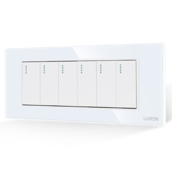 Rama 6M Luxion, LXI-GF006 Modul Intrerupator Simplu Mecanic 1M LUXION – LXI-008 Specificatii: Brand: Luxion Tip: Intrerupator Mecanic 6 Posturi Material: sticla Dimensiuni: 190 x 72 x 34 mm Distanta dintre suruburi: 100 x 60 mm (se prinde in 4 suruburi) Tensiune maxima: 100 – 250V Curent nominal: 16A Putere maxima: 3500W Protectie: IP44 Certificare: CE, RoHS