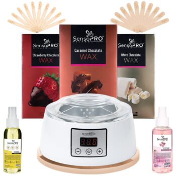 Kit Epilare Ceara Royal Chocolate Premium Care, SensoPRO Milano este kitul perfect pentru o sedinta de epilare rapida si eficienta. Acum, toate produsele de care ai nevoie sunt in acest kit unic: – 1 buc x Incalzitor ceara iSmart WAX PRO, LUXORISE- nuanta in functie de stocul disponibil – 1 buc xCeara Epilat Elastica SensoPRO Milano White Chocolate, 400g – 1 buc x Ceara Epilat Elastica SensoPRO Milano Strawberry Chocolate, 400g – 1 buc xCeara Epilat Elastica SensoPRO Milano Caramel Chocolate, 400g – 1 buc x Lotiune inainte de Epilare Blossom, 60ml SensoPRO Milano- aroma in functie de stocul disponibil – 1 buc x Ulei dupa Epilare Chamomile, 100ml, SensoPRO Milano- aroma in functie de stocul disponibil – 10 buc x Spatula mare ceara, SensoPRO Milano – 10 buc x Spatula mica ceara, SensoPRO Milano Echipamentele LUXORISE sunt prezente in saloanele de lux si se regasesc in recomandarile de top ale expertilor din industrie. Respectati intotdeauna modul de utilizare. Mod de utilizare: Epilare cu ceara: 1. Asaza incalzitorul pe o suprafata dreapta si rezistenta la temperatura; 2. Conecteaza incalzitorul la priza, apoi toarna cantitatea de ceara dorita in recipientul incalzitorului si pune capacul; 3. Apasa butonul ON/OFF si seteaza incalzitorul la temperatura maxima cu ajutorul butonului “+”. Pana ce atinge temperatura setata , incalzitorul va reda o lumina intermitenta in 3 culori. Aparatul va mentine temperatura setata timp de 2 ore. 4. Incalzeste ceara pana devine complet lichida, apoi pastreaz-o constant la o temperatura medie. Amesteca din cand in cand pentru a verifica soliditatea, ceara este gata de aplicare cand devine cremoasa (supravegheati constant ceara in momentul incalzirii). 5. Asigura-te ca temperatura cerii este confortabila pentru pielea ta. Poti face un test pe o mica portiune a pielii pentru a evita arsurile. 6. Incepe prin curatarea pielii cu Lotiunea înainte de Epilare SensoPRO Milano . Asigura-te ca pielea este complet uscata inainte de aplicarea cerii. 7. Foloseste o spatula pentru a aplica ceara in directia cresterii firelor de par, asteapta cateva secunde pentru a se întari ceara si apoi trage rapid in sens invers cresterii firelor de par. 8. Aplica Ulei dupa Epilare pentru a indeparta reziduurile de ceara si pentru a reduce roseata si iritatiile pielii. Evita expunerea la soare sau la bai fierbinti timp de cateva ore dupa epilare pentru a preveni iritatiile suplimentare. 9. Dupa utilizare, deconecteaza incalzitorul de la priza si curata-l pentru a indeparta resturile de ceara cazute pe acesta. Ceara si parafina se folosesc exclusiv pentru uz extern. A nu se aplica pe piele sensibila, afectata de leziuni sau pe zone sensibile. A nu se lasa la indemana copiilor . A se evita supraincalzirea. Se recomanda incalzirea precauta. ATENTIE: foarte fierbinte, poate cauza arsuri! Conditii de pastrare: Nu lasati produsul (ceara sau parafina) deschis si nefolosit pentru perioade mari de timp. A se pastra in spatii reci, uscate si aerisite, ferite de lumina directa a soarelui, a umezelii , a materialelor cu potential agresiv, eventuale lovituri, zgarieturi sau deformari. Se beneficiaza de garantia legala de conformitate asa cum aceasta este reglementata de dispozitiile Legii nr. 296/2004 privind Codul Consumului, cu modificarile si completarile ulterioare coroborate cu dispozitiile OUG nr. 140/2021 privind vanzarea produselor si garantiile asociate acestora, cu modificarile si completarile ulterioare.