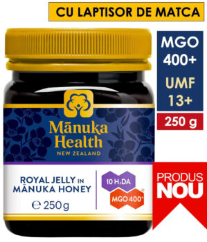 LAPTISOR DE MATCA pur (royal jelly) din Noua Zeelandă + Miere de Manuka MGO 400+ in același borcan; Este un amestec optim , primul produs de aceste fel. O feră beneficiile mierii de manuka + beneficiile lăptișorului de matca; Este practic mierea e Manuka iubita de toți clienții , MGO 400+ in care s-a introdus laptisor de matca pur; ManukaShop.ro este IMPORTATOR DIRECT certificat Manuka Health™ Noua Zeelandă si implicit al acestui produs Miere de Manuka MGO 400+ ce conține si laptisor de matca pur (royal jelly); Produsele Manuka Health™ Noua Zeelanda au certificare dubla Methylglyoxal MGO si UMF MIEREA DE MANUKA ESTE ORIGINALA ? IMPORTATOR DIRECT Achiziționați produsele din miere de Manuka întotdeauna de la ManukaShop.ro ca importator direct sau de la magazine autorizate VERIFICATI DACA IMPORTATORUL E CERTIFICAT Verificati pe site-ul producatorului din Noua Zeelanda ca numele importatorului apare pe lista de companii certificate pentru import si distributie TESTE CONCENTRATIE NATURALA MGO Verificati testele de concentratie naturala MGO ca sa vedeti ca e miere de Manuka originala si verificati certificatul de importator direct (LINK AICI cu certificarile ManukaShop.ro) (!) ATENTIE Cumparati numai miere Manuka produsa in Noua Zeelanda RECOMANDARE CONSUM LAPTISOR DE MATCA cu MIERE DE MANUKA CUM SE CONSUMA ? Utilizare interna : 1-2 lingurite pe zi pentru adulți si o linguriță pe zi pentru copii; Atentionari ! : Produsul nu este potrivit pentru copii cu varsta sub 12 luni (1 an). Acest produs nu este recomandat pentru peprsoanele ce au astm și stau diverse alergii astfel incat poate profoca reactii alergice severe. DETALII PRODUS Manuka Health™ MGO 400+ cu lăptișor de matca Mierea de Manuka MGO 400+ ce conține si laptisor de matca 10 HDA este produsul cel mai optim, având beneficiile ambelor produse într-unul.Contine laptisor de matca (royal jelly) 10 HDA din Noua Zeelandă. Lăptișorul de matcă este un superaliment natural cu b…