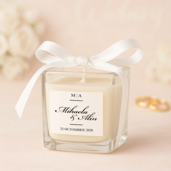 Alege o mărturie de nuntă elegantă și memorabilă : lumânarea parfumată în recipient din sticlă pătrată combină rafinamentul designului minimalist cu simbolismul gestului de recunoștință. Fiecare lumânare este turnată manual din ceară naturală de calitate, parfumată delicat, și finisată cu o fundiță satinat care poate fi asortată cu paleta cromatică a evenimentului. Eticheta personalizată permite imprimarea numelui mirilor, datei nunții sau inițialelor , transformând fiecare piesă într-o amintire unică. Recipientul de sticlă transparent oferă un aspect curat și elegant, ideal pentru decorul meselor de nuntă sau pentru oferirea invitaților ca dar simbolic. Avantaje: Lumânare parfumată turnată manual Recipient din sticlă pătrată, reutilizabil Fundiță satinat și etichetă personalizată Ambalaj elegant, potrivit pentru nuntă sau botez Produs artizanal, realizat cu atenție la detalii Un gest rafinat care transmite eleganță, emoție și recunoștință într-un mod parfumat și memorabil.