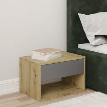Noptiera va ofera un cadru modern casei dumneavoastra datorita designului cromatic bine ales. Este realizat din Pal melaminat de 16mm, cu sertar din decor Stejar Artisan si carcasa decor Antracit. Aceasta a fost proiectata cu scopul de a imbunatati locuinta dumneavoastra prin oferirea de noi spatii de depozitare.. • Material: PAL melaminat de 16 mm, accesorii metalice, picioruse cui.. • Dimensiuni: 53 x 35 x 33 cm. • Garantie 2 ani. • Produsul se livreaza demontat, in cutii, cu toate accesoriile necesare asamblarii acestuia. *Obiectele de decor NU sunt incluse.