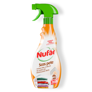 Nufăr – scos pete vă ajută să îndepărtaţi petele persistente, fără a ataca ţesătura sau culorile materialului. Îl recomandăm pentru toate tipurile de ţesături albe sau colorate, covoare şi tapiţerii, canapele, saltele, draperii. Este produsul ideal pentru îndepărtarea petelor de pe orice fel de ţesături albe sau colorate. Soluţia este foarte eficientă în eliminarea petelor de: alimente (ulei, untură, fructe, ketchup, vin roşu, legume, ciocolată, ceai, cafea, lapte), motorină, vaselină, machiaj (ruj, fard…