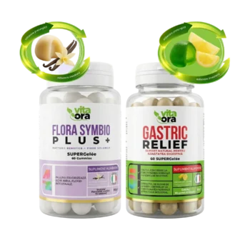 Abordare completă pentru sănătatea digestivă: echilibrezi flora intestinală și ameliorezi disconfortul gastric cu două formule complementare. Flora Symbio Plus+ (aromă de vanilie) combină prebiotice (inulină) și probiotice (fermenți lactici vii) pentru refacerea și menținerea echilibrului florei intestinale. Susține digestia, tranzitul intestinal și funcționarea normală a sistemului imunitar. Gastric Relief (aromă de lămâie) este formulat cu extract de mușețel, ghimbir și nalbă — plante cu tradiție în ameliorarea disconfortului gastric. Reduce balonarea, calmează mucoasa gastrică și susține o digestie ușoară. De ce acest pachet? ✔ Acțiune complementară: probiotice pentru floră + plante pentru confort gastric✔ Ingrediente naturale: inulină, fermenți lactici, mușețel, ghimbir, nalbă✔ Tehnologie SuperGelée — procesare la rece, masticabile, fără tablete✔ Fără zahăr, fără lactoză, fără gluten✔ Economisești 20% față de achiziția separată