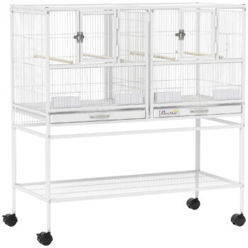 PawHut Colivie pentru Păsări Mare cu Despărțitor Roți 4 Hrănitoare 4 Tije din Lemn Raft 2 Tăvi Glisante 95×45,5×102 cm Alb | Aosom Romania