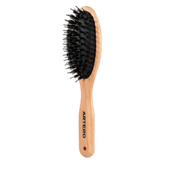 Peria Artero Nova este un instrument profesional de grooming, conceput pentru îngrijirea eficientă și delicată a blănii câinilor și pisicilor. Datorită combinației de peri din nylon pe două niveluri și designului ergonomic, această perie oferă o experiență de periaj naturală, fără a irita pielea animalului. Realizată din bambus sustenabil, peria Artero Nova este rezistentă, ușoară și confortabilă în utilizare. Structura perilor permite pătrunderea în profunzimea blănii, facilitând îndepărtarea părului mort și aranjarea firelor fără a deteriora textura naturală. Această perie este recomandată în special pentru câini cu blană dublă, blană lungă sau fir aspru, precum și pentru rase precum Spaniel sau Setter. Ofera volum si defineste straturile de blană, fiind ideală atât pentru întreținerea zilnică, cât și pentru finisajul după grooming. Beneficii principale:• peri din nylon pe două niveluri pentru descurcare eficientă• oferă volum natural blănii• protejează pielea și nu provoacă iritații• ideală pentru blană lungă, fină sau dublă• realizată din bambus, material durabil și eco• potrivită pentru uz profesional și acasă