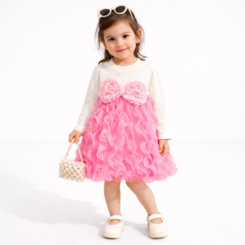 Această ținută rezolvă o problemă clasică a hainelor de ocazie pentru copii: combină aspectul spectaculos, de gală, cu libertatea de mișcare și confortul absolut necesar la o petrecere. Detaliile care o transformă într-o piesă „Wow”: ☁️ Top Confortabil: Partea superioară este realizată dintr-un material tip jerse reiat (elastic și moale) de culoare albă, cu mâneci lungi, care se mulează plăcut pe corp și nu irită pielea. 🎀 Fundă „Statement” Strălucitoare: Trecerea dintre top și fustă este marcată de o fundă supradimensionată roz, acoperită cu detalii sclipitoare (paiete), care captează lumina la fiecare mișcare. ✨ Fustă cu Efect 3D: Fusta este o adevărată capodoperă! Realizată din nenumărate straturi de tul roz vibrant, încrețite sub formă de volane bogate. Styling Ușor: Fiind o piesă atât de bogată vizual, o poți asorta simplu cu pantofiori albi și, opțional, o gentuță din perle pentru o notă extra de rafinament, exact cum o poartă micul nostru model. Unde o poate purta? Petreceri aniversare (perfectă pentru tema Prințese, Barbie sau Candy). Nunți, botezuri sau ca rochiță de domnișoară de onoare (flower girl). Ședințe foto de studio pline de viață. Specificații: Tip Produs: Rochie întreagă. Culoare: Alb (Top) + Roz Vibrant / Fucsia (Fustă). Materiale: Poliester. Detalii: Volane multiple 3D, fundă cu aplicații strălucitoare.