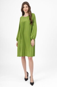 Rochie plisata midi, A-line cu maneca lunga cu elastic, verde deschis