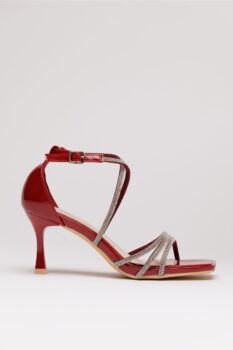 Sandale elegante rosii, cu toc subtire si barete decorate cu strasuri stralucitoare. Au varf patrat, o curelusa la glezna, care se inchide cu catarama. Sandale elegante Varf patrat Barete subtiri Toc subtire Inchidere tip curea cu catarama Material: Piele ecologica, strasuri Inaltime toc: 8 cm