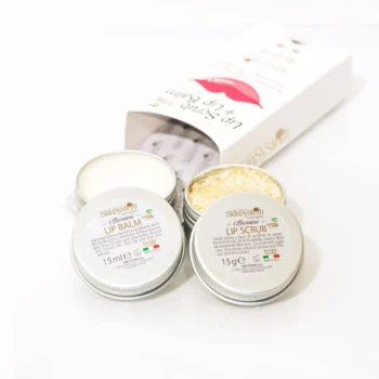 Scrub si balsam pentru buze hranite, hidratate si pline. SCRUB DE BUZE 15 g Scrub de buze cu trestie de zahar, unt de shea, ulei de migdale, ulei de cocos, ulei de masline si extract de Aloe Vera. Exfoliaza usor si va ofera buze moi si catifelate….