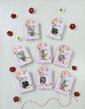 Acest set de martisoare premium este prezentat in cutii decorative individuale, cu design rafinat si detalii atent lucrate. Fiecare martisor este prevazut cu snur alb-rosu traditional si simboluri norocoase precum trifoi, potcoava, figurine decorative sau personaje tematice, fiind perfecte pentru a transmite un mesaj de primavara si noroc. Ambalajul tip cutie ofera un aspect elegant si protejeaza martisorul, fiind gata pentru a fi oferit fara alte pregatiri. Fundalul alb si decorul floral discret subliniaza caracterul premium al produsului, facandu-l potrivit atat pentru cadouri personale, cat si pentru evenimente corporate, scoli, gradinite sau vanzare online.