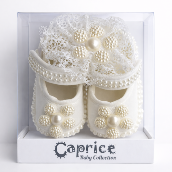 Set Alb Fetițe 2 Piese – Botoșei cu Dantelă și Bentiță Asortată – Modelul Floricele