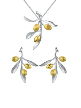 Un design rupt parcă dintr-un măslin mediteranean, cu iz de vacanță, piele bronzată și miros de mare și Grecia. Alege setul de bijuterii Olivo format din cercei, pandantiv și lănțișor forzantină de 45  cm. Realizat manual, din argint 925, „măsline” placate cu aur. Prindere cercei: cu șurub și cheiță. Dimensiuni cercei: 3 cm lungime, 2.2 cm latime. Dimensiuni pandantiv: 4 cm lungime, 3 cm latime. » Ambalaj cadou » Certificat de garanție și autenticitate. » Transport gratuit » La achiziția setului ai 10% reducere.
