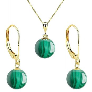 Set Aur 14 karate, Colier cu Pandantiv si Cercei cu Tortita Inchisa cu Pietre Semipretioase Naturale de Malachit de 10 mm