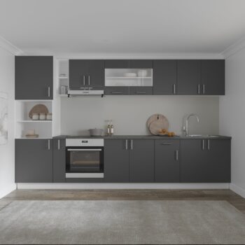 Bucataria Karo V33 – un spatiu de gatit elegant si eficient. Bucataria Karo V33 creeaza un spatiu de gatit care raspunde cerintelor moderne. Este construita din PAL melaminat de 16 mm. Carcasa este alba, moderna, iar fronturile decorate cu nuanta sofisticata de antracit adauga o nota de rafinament. Cu un blat decor Enkara, avand o grosime de 28 mm, bucataria Karo V33 impresioneaza estetic si rezista cu succes temperaturilor ridicate. Astfel, setul de bucatarie Karo V33 ofera durabilitate in timp.. Personalizeaza spatiul de gatit cu bucataria Karo V33. Designul modular aduce o nota de versatilitate in bucataria Karo V33. Corpurile interschimbabile iti permit sa iti configurezi bucataria intr-un mod personal. Aceasta abordare inovatoare iti ofera libertatea de a crea un spatiu de gatit unic, complet adaptat stilului si functionalitatii tale. Calitatea si durabilitatea stau la baza fiecarui detaliu al bucatariei Karo V33. Utilizarea PAL-ului melaminat de 16 mm si a PAL-ului de 28 mm asigura o structura solida. Accesoriile metalice ale setului de bucatarie modular Karo V33 adauga un finisaj premium si contribuie la performanta pe termen lung.. • Materiale: PAL melaminat 16 mm, PAL 28 mm, accesorii metalice. • Dimensiune: L 340 x l 60 x H 200 cm. • Garantie 2 ani. • Produsul se livreaza demontat, in cutii, cu toate accesoriile necesare asamblarii acestuia. *Electrocasnicele, chiuveta, bateria si celelalte obiecte de decor NU sunt incluse.. CORPURI INTERSCHIMBABILE. Dimensiune Ansamblu Inferior. • Corp Turn Karo, 2 Usi, cu spatiu cuptor: 60 x 50 x 200 cm. • Corp Baza Jolly Karo: 20 x 50 x 80 cm. • Corp Cuptor Karo: 60 x 50 x 80 cm. • Corp Baza Karo, 2 Usi: 80 x 50 x 80 cm. • Corp Baza Karo, 1 Sertar, 1 Usa: 40 x 50 x 80 cm. • Corp Masca Chiuveta Karo, 2 Usi: 80 x 50 x 80 cm. • Blat: 120 x 60 cm. • Blat: 160 x 60 cm. Dimensiune Ansamblu Superior. • Corp Superior Karo, O Polita: 20 x 28 x 60 cm. • Corp Superior Hota Karo: 60 x 30 x 45 cm. • Corp Superior Karo, 2 Usi, cu sticla: 80 x 30 x 60 cm. • Corp Superior Karo, 1 Usa: 40 x 30 x 60 cm. • Corp Superior Karo, 2 Usi: 80 x 30 x 60 cm. *Accesorii incluse: feroneria necesara montajului, plinta PVC alba, imbinare unghi plinta, terminatii plinte, set bride plinta