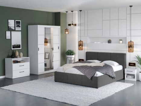 Set Dormitor Nordis Alb C33 tapitat / oglinda Un dormitor matrimonial ce are dulapul cu usi glisante cu dimensiuni generoase. Restul corpurilor de mobilier, comoda si noptierele ofera la randul lor spatii de depozitare in completarea dulapului, prin sertare . Patul tapitat are somiera fixa inclusa , ce ofera un suport optim pentru saltea. De asemenea, pentru patul din Set Dormitor Nordis Alb C33 tapitat / oglinda puteti alege dintre dimensiunile de 140, 160 si 180×200 cm . Usile dulapului sunt glisante si nu necesita spatiu exterior suplimentar pentru deschidere, acestea pot fi puse in orice ordine doriti . Sistemul de glisare este metalic. Oglinda, pe langa utilitatea sa de baza, da senzatia de camera marita si spatioasa. Usile prezinta pe suprafata lor baghete orizontale cu finisaj gri mat, acestea se pot aplica optional in functie de dorinta clientului la montaj. Se pot aplica in pozitia propusa de noi sau in orice pozitie doriti. Corpuri Set Dormitor Nordis Alb C33 tapitat / oglinda Dulap 1.38m – L 138 x A 55 x H 194.8cm – Schita Montaj Compartimentat cu 5 polite si 2 bare de umerase. Kit sertare dulap (optional) – Schita Montaj Un kit contine 2 sertare, alegeti de la 1 pana la 3 kituri de sertare. Pat tapitat matrimonial fix – L 150/170/190 x A 216 x H 93 cm – Schita Pat Suport de saltea inclus. Sustine pana la 300kg. Set noptiere – L 39 x A 30.4 x H 41.5cm – Schita Montaj Cu sertare si spatiu generos. Comoda (optional) – L 83 x A 42.3 x H 71.7cm – Schita Montaj Spatiu depozitare deschis si doua sertare. Livrare Gratuita prin flota proprie Suntem producatori de mobilier Toate corpurile au o garantie de 2 ani Video de prezentare familie Videoul de prezentare poate contine mai multe corpuri de mobilier sau mai putine in comparatie cu produsul de pe aceasta pagina. Scopul acestui video este de a detalia aspectul materialelor, accesoriilor cat si a familiei din care face parte. Pat Tapitat Avelis cu somiera fixa Acest Pat tapitat Avelis cu somiera fixa are o forma dreptunghiulara, compacta si un aspect curat, usor de integrat in orice dormitor. Suportul inclus este realizat din lemn stratificat cu lamele din lemn , ce ofera un suport optim pentru saltea. Patul are picioruse de 3 cm, care permit aerului sa circule, astfel se ventileaza salteaua si spatiul din cadrul patului. Tapiteria este din stofa catifea gri antracit, completand perfect corpurile din Set Dormitor Nordis Alb C33 tapitat / oglinda. Dimensiuni Pat Avelis Latime: 150 / 170 / 190 cm Adancime: 216 cm Inaltime capat mare: 93 cm Inaltime capat mic: 36.5 cm Spatiu incadrament saltea: 6 cm (cat intra salteaua in cadru) Greutate maxima recomandata: 300kg Patul are somiera fixa inclusa, nu se percep costuri suplimentare. Saltea Compatibila 140×200 cm, 160×200 cm sau 180×200 cm in functie de dimensiunea de pat aleasa. Salteaua nu este inclusa! Bifati sus ca doriti. Materialul din spatele tabliei este diferit de tapiteria din fata. Este o tesatura neagra, cu o textura diferita. Set Dormitor Nordis Alb C33 tapitat / oglinda Face parte din familia de mobila pentru dormitor Nordis . O solutie ideala pentru un dormitor matrimonial. Corpurile din Set Dormitor Nordis Alb C33 tapitat / oglinda sunt realizate din PAL melaminat cu finisaj Alb, care creeaza un spatiu rafinat si un ambient placut. Cantul aplicat este unul de 0,6 ce le permite muchiilor sa fie placute la atingere fiind finisate si atent retusate. Pretul afisat nu include alte accesorii sau obiecte de decor (tablouri, elemente de iluminat, asternuturi, covor etc.) Produsul se livreaza demontat si este insotit de accesorii si instructiuni de asamblare. Dimensiunile sunt exprimate in cm si pot oscila intre ± 10 mm.