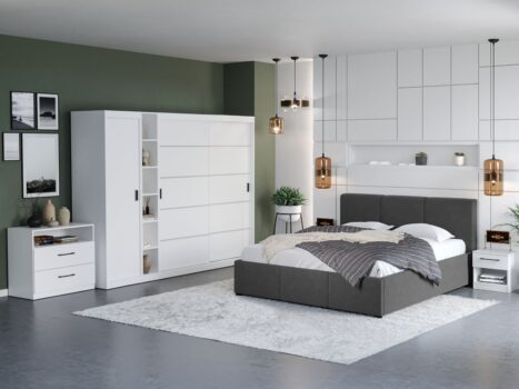 Set Dormitor Nordis Alb C35 tapitat Un dormitor matrimonial ce are dulapul cu usi glisante cu dimensiuni generoase. Restul corpurilor de mobilier, comoda, noptierele ofera la randul lor spatii de depozitare in completarea dulapului, prin sertare . Patul tapitat are somiera fixa inclusa , ce ofera un suport optim pentru saltea. De asemenea, pentru patul din Set Dormitor Nordis Alb C35 tapitat puteti alege dintre dimensiunile de 140, 160 si 180×200 cm . Usile dulapului sunt glisante si nu necesita spatiu exterior suplimentar pentru deschidere, acestea pot fi puse in orice ordine doriti . Sistemul de glisare este metalic. Usile prezinta pe suprafata lor baghete orizontale cu finisaj gri mat, acestea se pot aplica optional in functie de dorinta clientului la montaj. Se pot aplica in pozitia propusa de noi sau in orice pozitie doriti. Corpuri Set Dormitor Nordis Alb C35 tapitat Dulap 1.84m – L 184 x A 55 x H 194.8cm – Schita Montaj Compartimentat cu 5 polite si 2 bare de umerase, cu usi glisante. Dulap Soldat Alb – L 44.4 x A 55 x H 194.8cm – Schita Montaj Compartimentat cu 5 polite, cu deschidere clasica pe balamale. Dulap cu polite – L 28 x A 33.6 x H 194.8cm – Schita Montaj Compartimentat cu 6 polite. Corp sertar (optional) – Schita Montaj Un corp contine 2 sertare. Alegeti de la 1 pana la 3 corpuri de sertare. Pat tapitat matrimonial fix – L 150/170/190 x A 216 x H 93 cm – Schita Pat Suport de saltea inclus. Sustine pana la 300kg. Set noptiere – L 39 x A 30.4 x H 41.5cm – Schita Montaj Cu sertare si spatiu generos. Comoda (optional) – L 83 x A 42.3 x H 71.7cm – Schita Montaj Spatiu depozitare deschis si doua sertare. Livrare Gratuita prin flota proprie Suntem producatori de mobilier Toate corpurile au o garantie de 2 ani Video de prezentare familie Videoul de prezentare poate contine mai multe corpuri de mobilier sau mai putine in comparatie cu produsul de pe aceasta pagina. Scopul acestui video este de a detalia aspectul materialelor, accesoriilor cat si a familiei din care face parte. Pat Tapitat Avelis cu somiera fixa Acest Pat tapitat Avelis cu somiera fixa are o forma dreptunghiulara, compacta si un aspect curat, usor de integrat in orice dormitor. Suportul inclus este realizat din lemn stratificat cu lamele din lemn , ce ofera un suport optim pentru saltea. Patul are picioruse de 3 cm, care permit aerului sa circule, astfel se ventileaza salteaua si spatiul din cadrul patului. Tapiteria este din stofa catifea gri antracit, completand perfect corpurile din Set Dormitor Nordis Alb C35 tapitat. Dimensiuni Pat Avelis Latime: 150 / 170 / 190 cm Adancime: 216 cm Inaltime capat mare: 93 cm Inaltime capat mic: 36.5 cm Spatiu incadrament saltea: 6 cm (cat intra salteaua in cadru) Greutate maxima recomandata: 300kg Patul are somiera fixa inclusa, nu se percep costuri suplimentare. Saltea Compatibila 140×200 cm, 160×200 cm sau 180×200 cm in functie de dimensiunea de pat aleasa. Salteaua nu este inclusa! Bifati sus ca doriti. Materialul din spatele tabliei este diferit de tapiteria din fata. Este o tesatura neagra, cu o textura diferita. Set Dormitor Nordis Alb C35tapitat Face parte din familia de mobila pentru dormitor Nordis . O solutie ideala pentru un dormitor matrimonial. Corpurile din Set Dormitor Nordis Alb C35 tapitat sunt realizate din PAL melaminat cu finisaj Alb, care creeaza un spatiu rafinat si un ambient placut. Cantul aplicat este unul de 0,6 ce le permite muchiilor sa fie placute la atingere fiind finisate si atent retusate. Pretul afisat nu include alte accesorii sau obiecte de decor (tablouri, elemente de iluminat, asternuturi, covor etc.) Produsul se livreaza demontat si este insotit de accesorii si instructiuni de asamblare. Dimensiunile sunt exprimate in cm si pot oscila intre ± 10 mm.