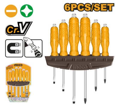 Material: 40Cr; Set 6 buc. de șurubelnițe: 1 buc. SL5.5 * 75mm; 1 buc. SL6.5 * 100mm; 1 buc. SL8.0 * 150mm; 1 buc. PH1 * 75mm; 1 buc. PH2 * 100mm; 1 buc. PH3 * 150mm; Datorita hexagonului de pe maner se pot actiona si cu cheie fixa; Suport special pentru organizarea si depozitarea acestora; Maner in stil INGCO, cu forma si suprafata speciala anti-alunecare, confortabil si ergonomic; Maner prevazut cu gaura pentru agatare sau folosirea unei parghii
