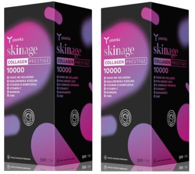 Skinage Colagen Prestige, 500ML, 2 BUCATI Supliment alimentar lichid ce contine colagen de pește hidrolizat. Contine 10.000 mg de colagen hidrolizat, 100 mg de acid hialuronic, 100 mg de vitamina C, vitamine din complexul B , mangan si zinc. Beneficii colagen Prestige: redă strălucirea și elasticitatea pielii ajută la reducerea ridurilor mentine un aspect sanatos si luminos al pielii si fetei redă strălucirea și rezistența părului și a unghiilor păstrează oasele și țesuturile conjunctive din organism întărește oasele, articulațiile, părul și unghiile susține producția și sinteza naturală de colagen pentru îngrijirea generală a corpului, a pielii și a feței Descriere: O combinație de colagen, acid hialuronic și complex de vitamina B ce hrănește pielea din interior iar vitamina C contribuie la formarea normală de colagen pentru mentinerea funcției normale a pielii, dar si la protejarea celulelor impotriva stresului oxidativ, reducerea ridurilor si redarea aspectului tineresc al pielii. Odată cu îmbătrânirea, capacitatea organismului de a produce colagen si acid hialuronic scade, astfel încât pielea începe să-și piardă elasticitatea si supletea, ceea ce duce la apariția ridurilor. Colagenul hidrolizat îmbunătățește elasticitatea și fermitatea pielii și reduce vizibilitatea ridurilor. Este cea mai comună proteină din corpul nostru. Contribuie la formarea pielii, părului și a țesutului conjunctiv. Asigura fermitate pielii si leaga cantitati mari de apa. După vârsta de 25 de ani, sinteza colagenului scade cu 1,5% anual ceea ce duce la aparitia ridurilor, o piele uscată, păr fragil și tern. Acidul hialuronic leaga si absoarbe apa, hraneste si hidrateaza colagenul. 1 g de acid hialuronic = 6 litri de apă Zincul leaga si absoarbe apa, hraneste si hidrateaza colagenul. 1 g de acid hialuronic = 6 litri de apă Complexul de vitamine B Vitamina B2 protejeaza pielea. Vitamina B3 ajuta pielea uscata si inflamata. Vitamina B5 hidratează pielea și ajută la prevenirea diferitelor afectiuni ale pielii. Biotina previne descuamarea pielii. Manganul contribuie la la protejarea celulelor împotriva stresului oxidativ si la formarea normală a țesutului conjunctiv. În timpul îmbătrânirii, fibrele de colagen încep să se separe, iar interstițiile umplute cu acid hialuronic se micșorează și se golesc . Aportul de colagen Prestige asigură colagen suplimentar și acid hialuronic în organism. Este dovedit clinic că aportul de 10 grame de colagen marin hidrolizat cu Naticol timp de șase săptămâni reduce aspectul ridurilor și îmbunătățește elasticitatea pielii. Naticol colagen hidrolizat: Conține o proporție mare de aminoacizi esențiali S-a dovedit a avea efect asupra procesului anti-îmbătrânire Crește etanșeitatea și elasticitatea pielii Încurajează sinteza naturală a colagenului în fibroblasti. Vitamina C este necesară pentru sinteza colagenului, oferă energie celulelor si protejează pielea împotriva daunelor oxidative. Colagenul sub formă lichidă asigură o absorbție rapidă și o eficiență mai mare, ceea ce contribuie la frumusețea pielii pe termen lung. Mod de administrare: A se lua cate 50 ml o dată pe zi. Ingrediente: apa purificata, colagen marin hidrolizat (peste), indulcitori: fructoza, sucroza, corector de aciditate: acid citric monohidrat, acid L-ascorbic, potentiator de aroma: fructe de padure, hialuronat de sodiu, conservant: sorbat de potasiu, gluconat de zinc, complex de vitamina B (nicotinamida, D-pantotenat de calciu, riboflavina, clorhidrat de piridoxina, clorhidrat de tiamina, acid pterollmonoglutamic, D-biotina, cianocobalamina); gliconat de mangan, colorant: cochineal. Contine in dozele recomandate: 50ml % * NRV Colagen 10 g – Acid hialuronic 100 mg – Vitamina C 100 mg 125 Vitamina B1 1,1 mg 100 Vitamina B2 1,4 mg 100 Vitamina B6 1,4 mg 100 Vitamina B12 25 µg 100 Acid folic 200 µg 100 Biotina 50 µg 100 Acid pantotenic 6 mg 100 Niacina 16 mg NE 100 Zinc 10 mg 100 Mangan 2 mg 100 Note si depozitare: A nu se lăsa la îndemâna copiilor mici. Doza zilnică recomandată nu trebuie depășită. Suplimentul alimentar nu este un înlocuitor sau un substitut pentru o dietă echilibrată. O dietă echilibrată și variată și un mod de viață sănătos sunt importante pentru sănătate. Nu se recomanda femeilor insarcinate sau care alapteaza. A se păstra sub 25 ° C într-un loc uscat. Cantitate: 500 ml