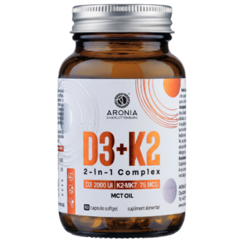 Vitaminele D3 și K2, într-o formulă softgel cu ulei MCT din cocos, creată pentru absorbție eficientă și echilibru zilnic. – Combină 2 vitamine-cheie: Vitamina D3 (2000 UI – colecalciferol) și Vitamina K2 (MK-7 – 75 mcg), care acționează complementar în organism, susținând utilizarea corectă a calciului; – Susține sănătatea oaselor și a dinților, prin rolul vitaminei D3 în absorbția calciului și al vitaminei K2 în gestionarea lui la nivel osos; – Contribuie la funcționarea normală a sistemului imunitar, prin aportul de Vitamina D3, esențial mai ales în perioadele cu expunere redusă la soare; – Sprijină funcționarea normală a mușchilor, Vitamina D3 având un rol direct în acest proces fiziologic; – Contribuie la coagularea normală a sângelui, prin Vitamina K2, un nutrient esențial pentru acest mecanism natural; – Vine sub formă de capsule softgel, o alegere premium pentru vitaminele liposolubile, concepută pentru administrare ușoară și absorbție eficientă; – Conține ulei MCT din cocos, integrat direct în formulă, care creează mediul lipidic optim pentru absorbția și utilizarea celor 2 vitamine vitaminelor; – Vine la flacon de 60 de capsule softgel, suficiente pentru 2 luni de administrare zilnică; – Este un supliment alimentar notificat, realizat conform standardelor de calitate în vigoare.